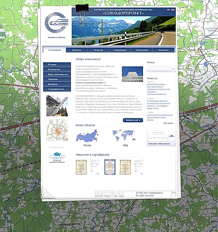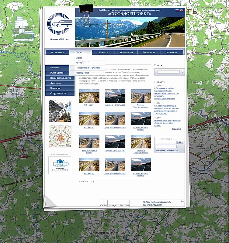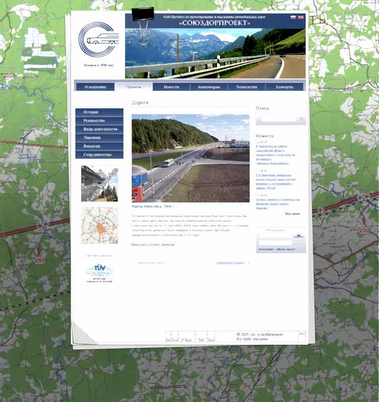 Интернет представительство компании ОАО «Институт по проектированию и изысканиям автомобильных дорог «Союздорпроект»,включающее каталог проектов.